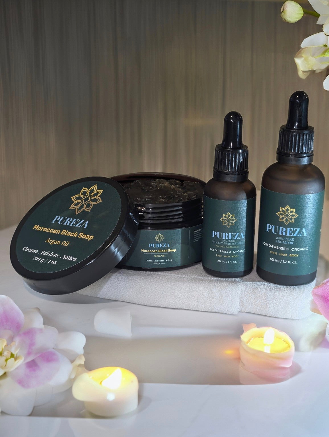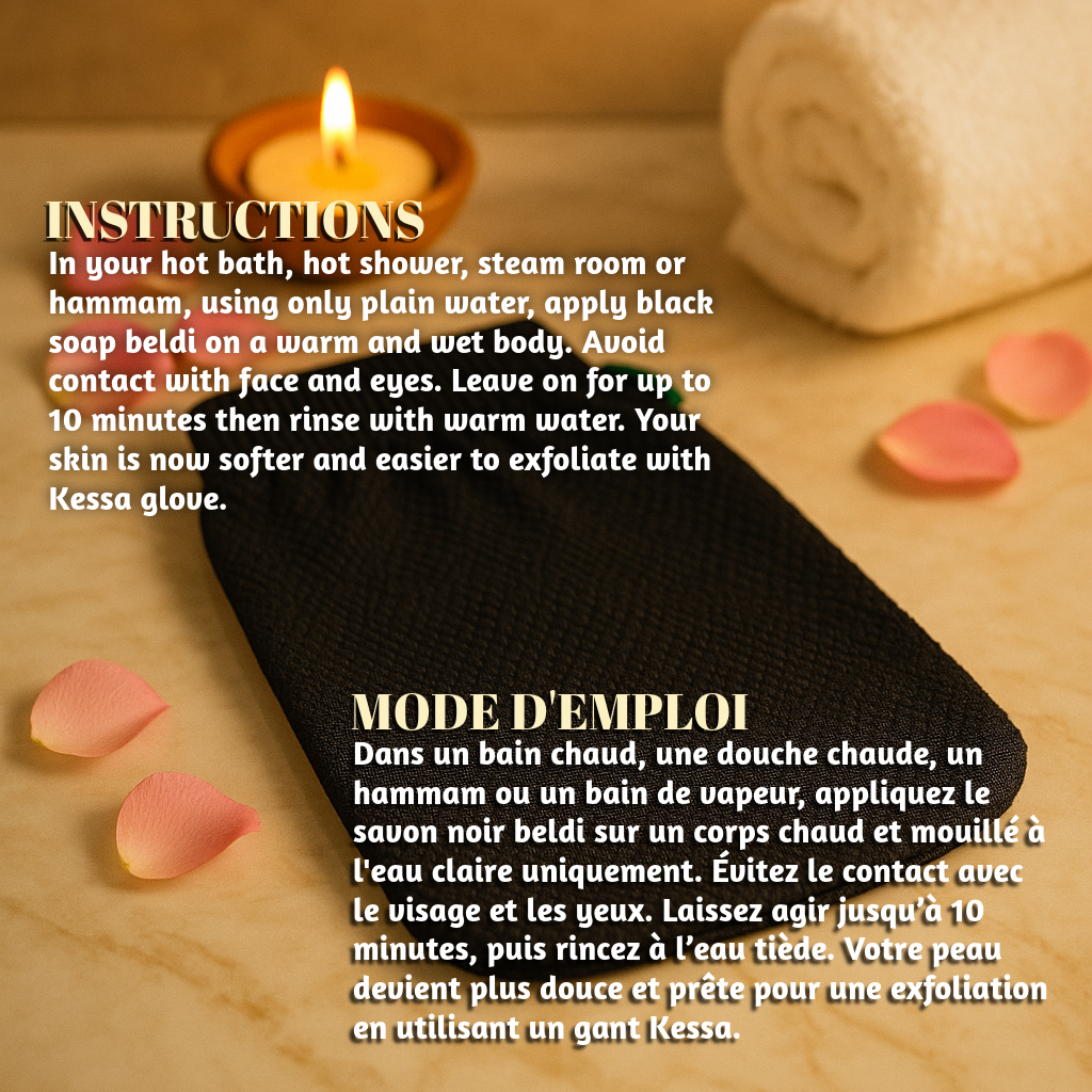 Crafted from crushed black olives and enriched with vitamin E and argan oil, PUREZA’s Beldi Black Soap is a time-honored Moroccan ritual. Gently scented and deeply nourishing, it purifies, softens, and prepares the skin for exfoliation.